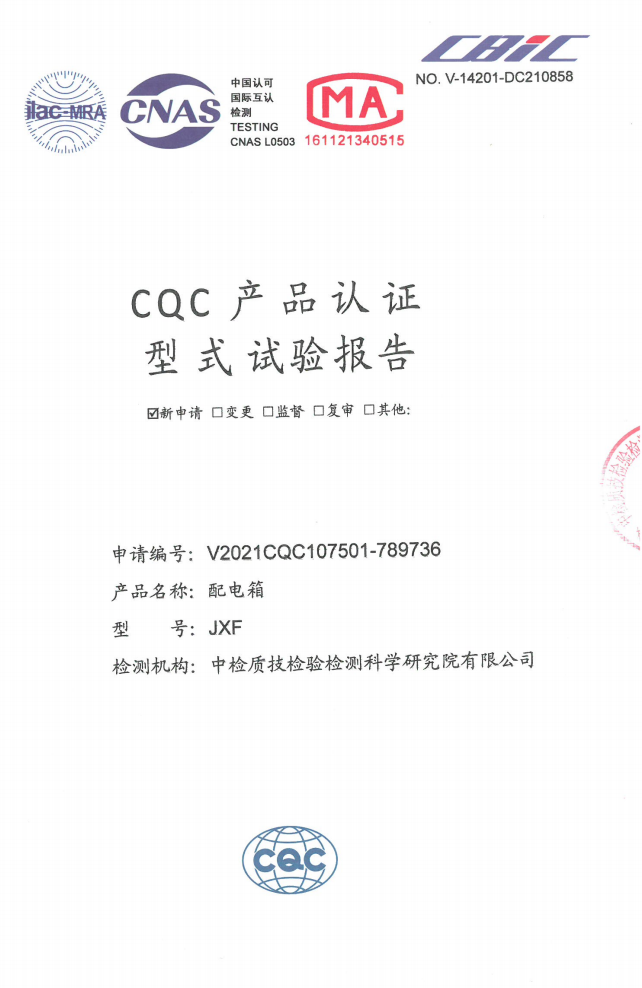 JXF配電箱產(chǎn)品認證型式試驗報告
